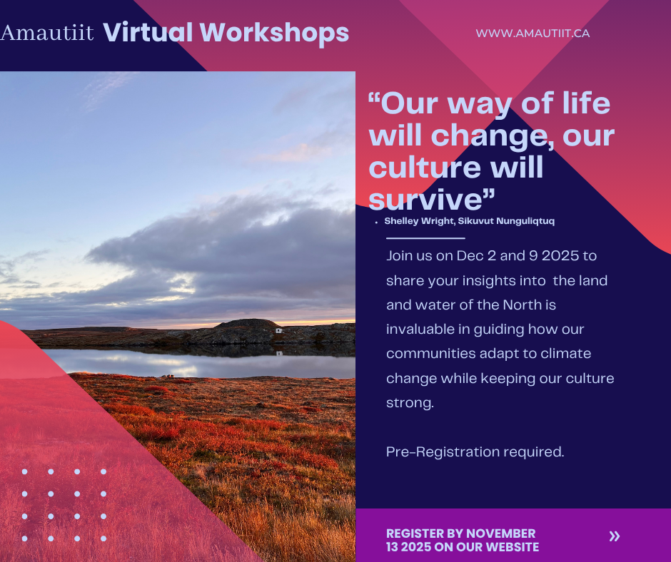 Amautiit Nunavut Inuit Women’s Association is honoured to invite Inuit women to take part in two upcoming virtual, Arctic Workshops. These gatherings will focus on climate change, leadership, and Inuit knowledge — recognizing that Inuit women have invaluable insight into the land and water of the North.